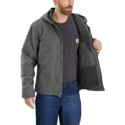 This men’s Carhartt jacket is made of washed cotton duck that has a broken-in look and feel. It has a soft sherpa fleece-lined body that keeps your core warm, and the sleeves are lined with quilted nylon for easy on and off.