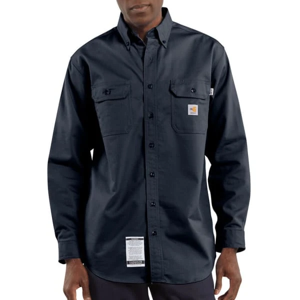 This classic Carhartt men’s button-down work shirt is flame-resistant and made to meet NFPA 70E performance requirements. The cotton and nylon twill construction with triple-stitched seams will protect you from dangerous arcs and flames on the job. The shirt is finished with flame-resistant buttons and two flap pockets on the chest.