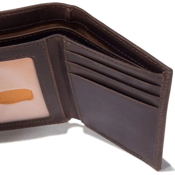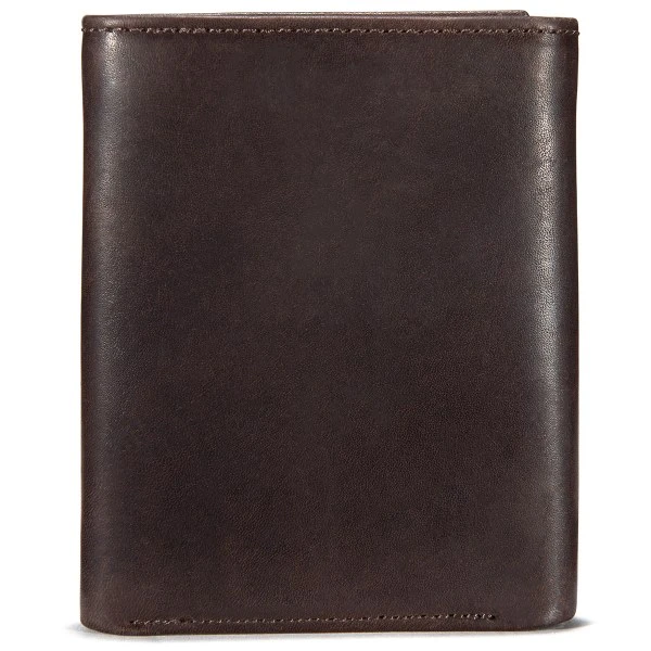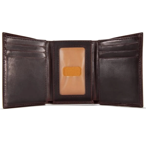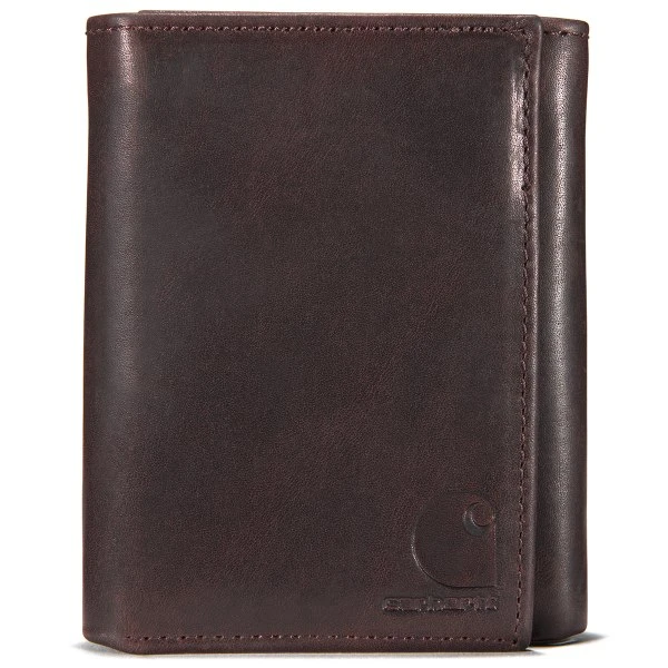 This men’s trifold wallet has a simple, old-school design. It’s made of durable full-grain leather with a rich oil finish that has a slight shine. An embossed Carhartt logo is its seal of quality.