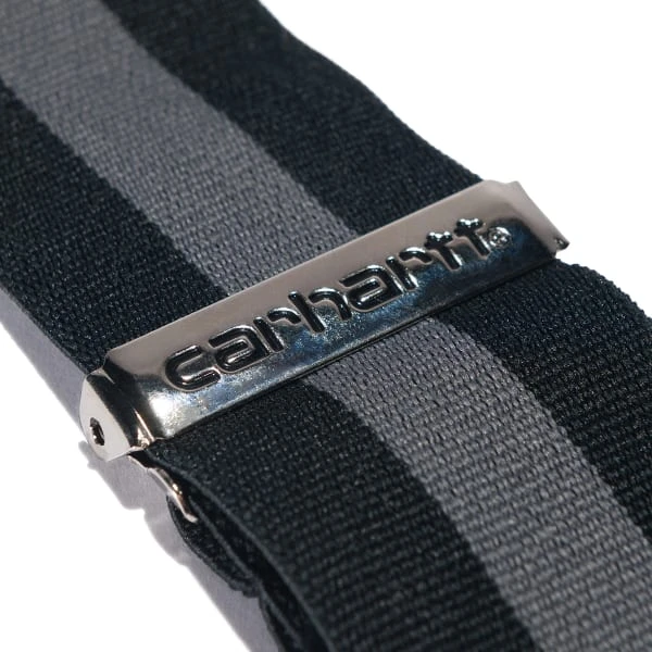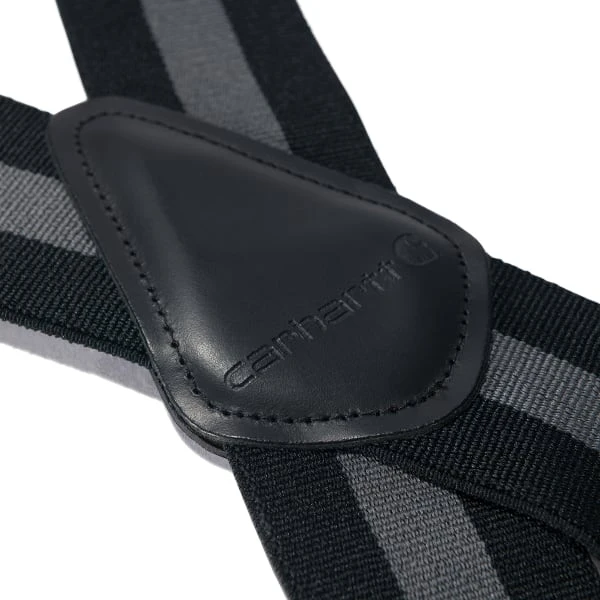 - Two-inch heavy duty elastic suspender straps with contrast color stripe down the center