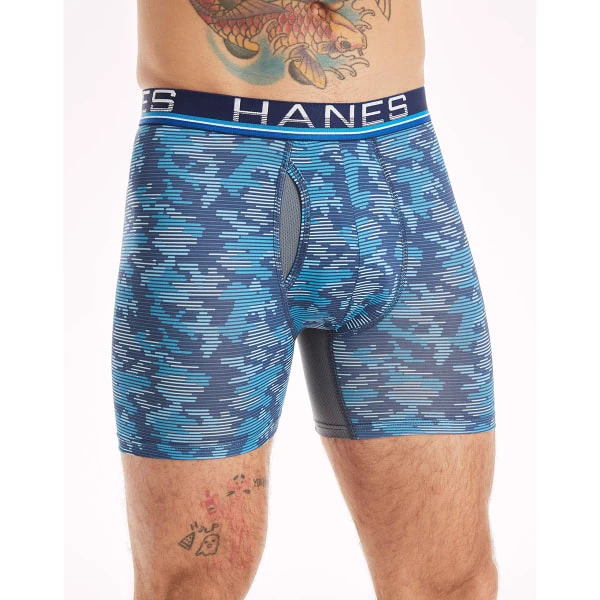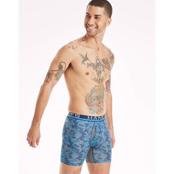 Meet the latest in innovative, supportive boxer briefs for men: Hanes Total Support Pouch with X-Temp cooling technology. This moisture-wicking underwear pack is one of our most comfortable styles yet, thanks to the anti-chafing design and X-Temp cooling technology that starts cool and keeps cool. The patented breathable mesh pouch liner helps prevent chafing by separating and supporting, while the lightweight stretch fabric moves with you, making them a great addition to your workout or hangout gear. These quick-dry moisture-wicking underwear also have advanced odor control, so you stay fresh and dry, no matter what your day brings. And the best part of all? These men’s boxer briefs come in a convenient 4-pack with an array of blue and black patterns that you’ll love.